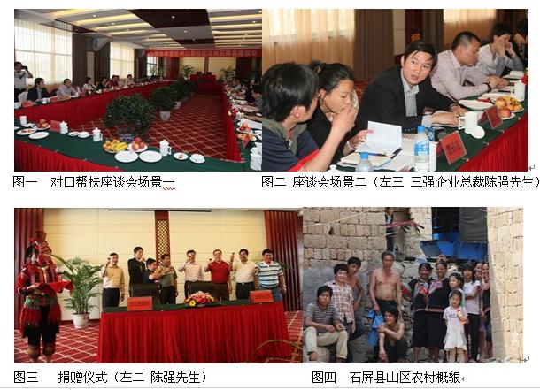 在这春风宜人的季节,涌动着一股如潮的暖流。2012年4月19日至22日,上海三强企业总裁陈强先生携夫人陈叶女士奔赴云南省红河州石屏县,参加由上海市奉贤区党政领导班子率领的对口帮扶考察工作。考察期间,陈强先生参加了4月20日召开的奉贤区对口帮扶石屏县座谈会,并在举行的签约、捐赠仪式上,向石屏县龙武镇石岩头小学捐赠50万元,为当地捐资援建学校,学校建成后将被命名为“上海三强希望学校”。